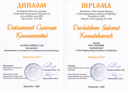 Давлатшоев Саломат Қаноатшоевич избран действительным членом (академиком) Инженерной академии Таджикистана, что является признанием его выдающегося вклада в развитие науки и инженерного дела Республики Таджикистан.