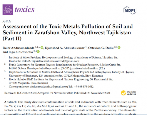 Abstract: This study discusses contamination of soils and sediments with trace elements such as Mn, Ba,W, V, Co, Cr, Zn, Ni, As, Sb Hg as well as Th and U, the influence of natural and anthropogenic factors on the distribution of elements and the ecological state of the Zarafshon Valley. The elemental composition of 116 soil and sediment samples were analyzed by the neutron activation analysis. The calculation of the geoaccumulation index (Igeo), contamination factor (CF) and pollution load index (PLI) showed that some places in the investigated region with developed the industrial zones (around mining and processing plants of “Anzob”, “Konchoch”, “Kumargi bolo” and “Mogiyon”) are mostly polluted by As, Sb, Hg, and in rare cases, the high concentration ofWand V were determined.