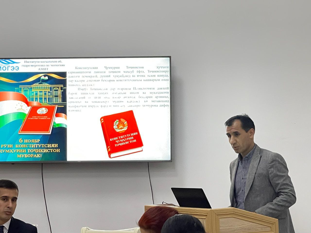 Муовини директор оид ба илм ва таълим, Алиев Фирдавс, зимни суханронӣ табрикоти самимии худро аз номи директори институт Гулаҳмадзода Аминҷон ба иштирокчиёни чорабинӣ расонида, қайд намуд, ки 31 сол қабл, 6 ноябри соли 1994, мардуми Тоҷикистон, бо вуҷуди мушкилоти сиёсиву иҷтимоии рӯз, бо рӯҳияи умед ва боварӣ ба иқтидор ва маҳорати фарзона, Пешвои миллат, Эмомалӣ Раҳмон, дар як раъйдиҳии умумихалқӣ Конститутсияро қабул карданд ва ба ин васила сарнавишти худро муайян намуданд.