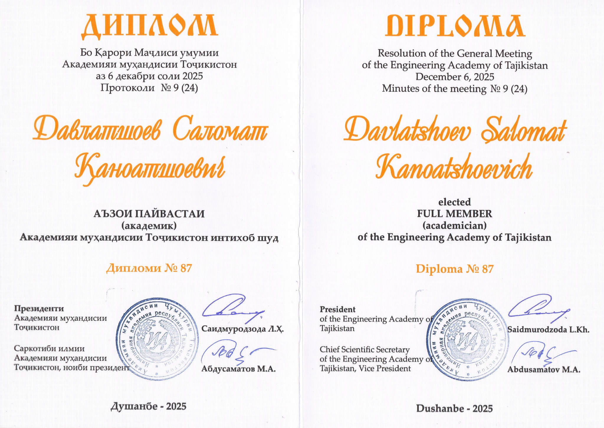 Давлатшоев Саломат Қаноатшоевич избран действительным членом (академиком) Инженерной академии Таджикистана, что является признанием его выдающегося вклада в развитие науки и инженерного дела Республики Таджикистан.